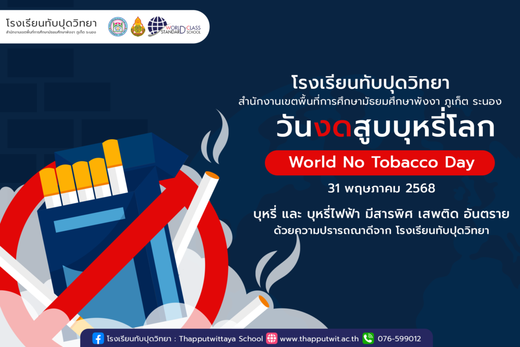 โรงเรียนทับปุดวิทยาได้จัดกิจกรรม วันงดสูบบุหรี่โลก (World No Tobacco Day) เพื่อรณรงค์สร้างความตระหนักรู้เกี่ยวกับพิษภัยของบุหรี่ และส่งเสริมให้นักเรียนมีสุขภาพที่ดี ห่างไกลจากบุหรี่และสารเสพติด โดยมุ่งเน้นการปลูกฝังให้นักเรียนตระหนักถึงผล กระทบของการสูบบุหรี่ที่มีต่อสุขภาพของตนเองและผู้อื่น