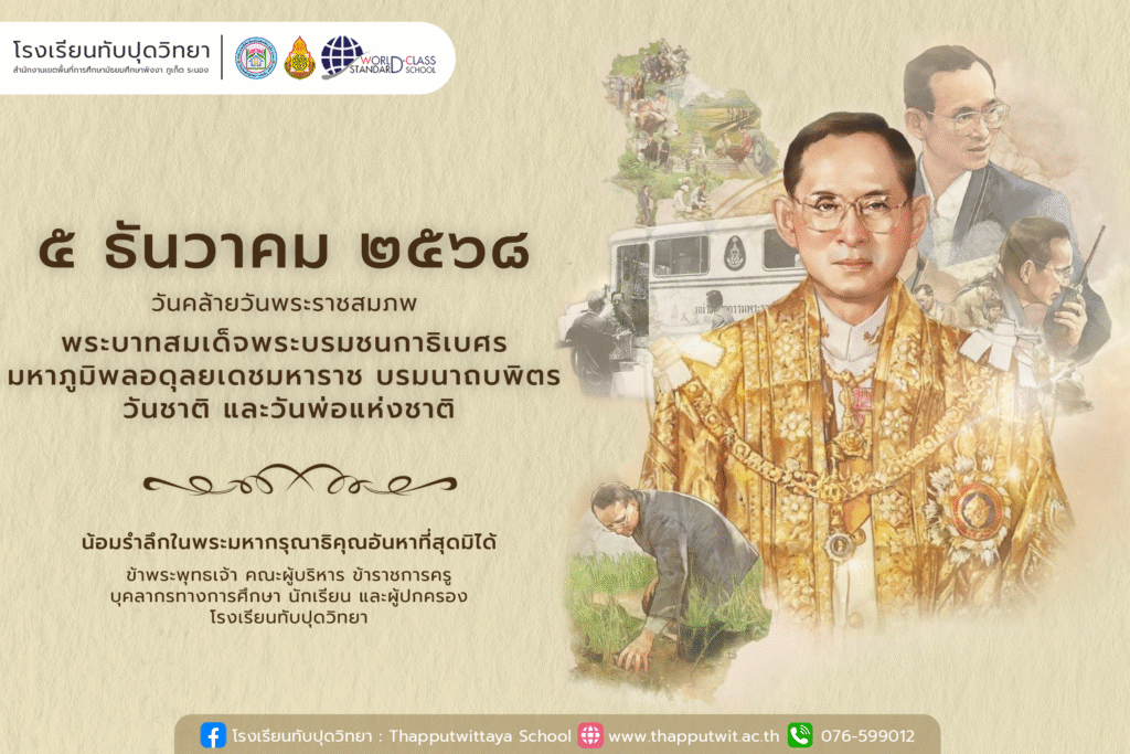 5 ธันวาคม พ.ศ. 2568 น้อมรำลึกในพระมหากรุณาธิคุณอันหาที่สุดมิได้ เนื่องในวันคล้ายวันพระราชสมภพของพระบาทสมเด็จพระบรมชนกาธิเบศร มหาภูมิพลอดุลยเดชมหาราช บรมนาถบพิตร วันชาติและวันพ่อแห่งชาติ