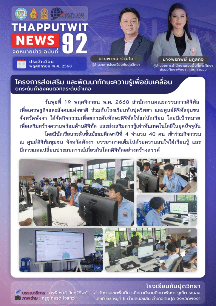 โรงเรียนทับปุดวิทยา ร่วมยกระดับทักษะดิจิทัลให้แก่นักเรียนชั้น ม.4 ณ ศูนย์ดิจิทัลชุมชน จังหวัดพังงา