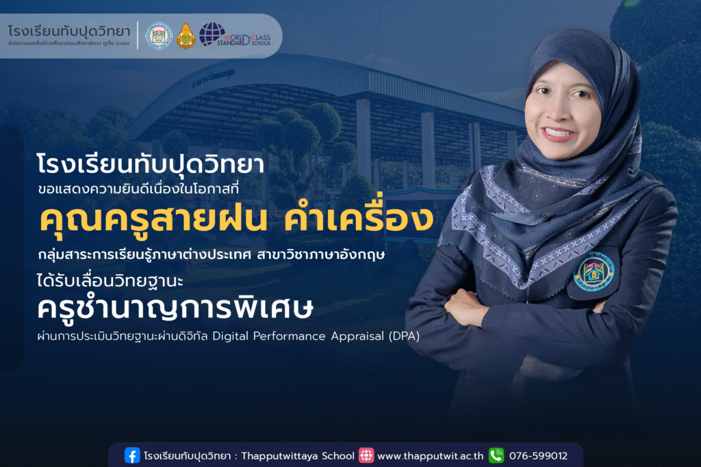 โรงเรียนทับปุดวิทยาขอแสดงว่ายินดีกับนางสาวสายฝน คำเครื่อง ครูกลุ่มสาระการเรียนรู้ภาษาต่างประเทศ สาขาวิชาภาษาอังกฤษ ผู้ผ่านการประเมินวิทยฐานะผ่านดิจิทัลDigital Performance Appraisal (DPA) ได้เลื่อนวิทยฐานะครูชำนาญการพิเศษ