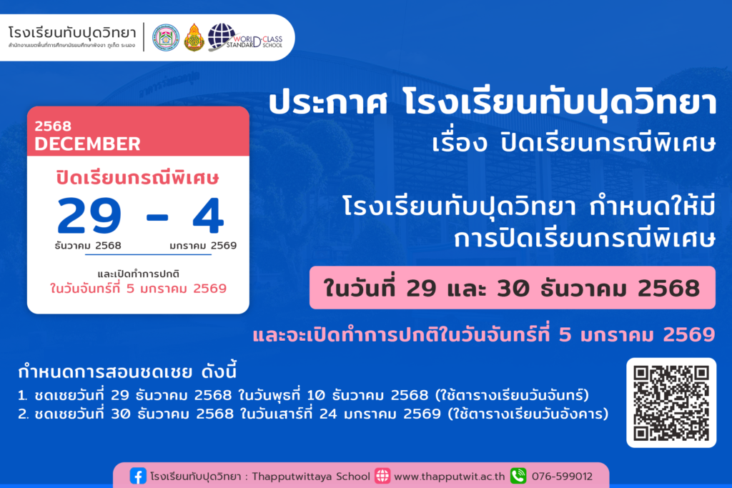 โรงเรียนทับปุดวิทยา ขอแจ้ง ปิดเรียนเป็นกรณีพิเศษ เนื่องในช่วงเทศกาลปีใหม่ ระหว่าง