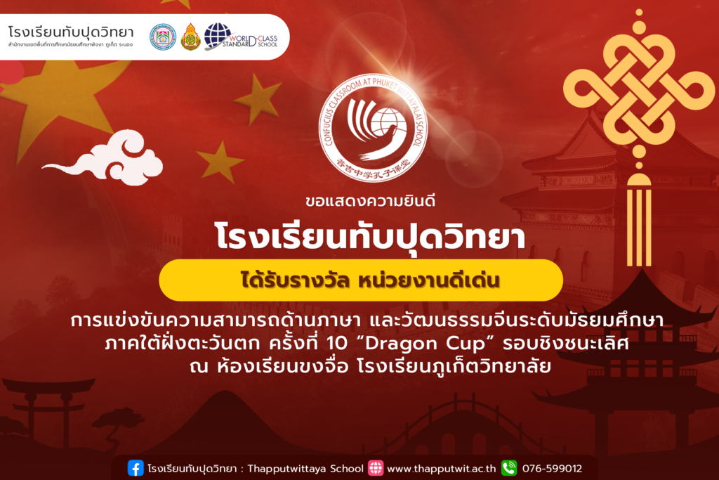 จากการแข่งขันความสามารถด้านภาษาและวัฒนธรรมจีนระดับมัธยมศึกษาภาคใต้ฝั่งตะวันตก ครั้งที่ 10 “Dragon Cup” รอบชิงชนะเลิศ ณ ห้องเรียนขงจื่อ โรงเรียนภูเก็ตวิทยาลัย