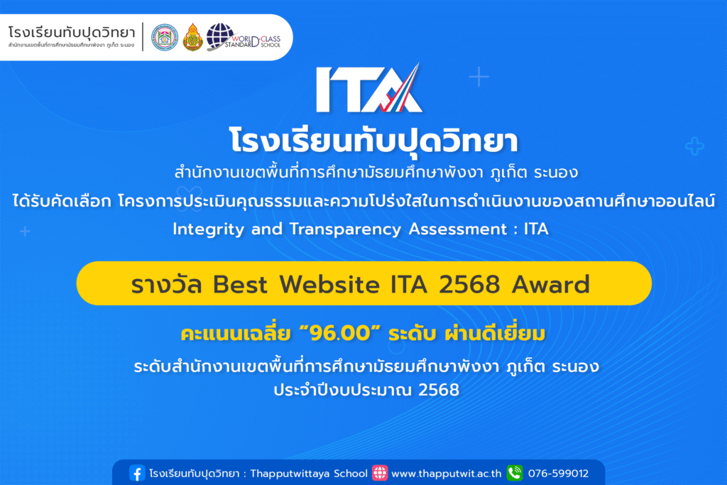 โรงเรียนที่ได้รับรางวัล Best Website ITA 2568 Award ได้แก่ โรงเรียนทับปุดวิทยา คะแนนเฉลี่ย “96.00” ระดับ ผ่านดีเยี่ยม